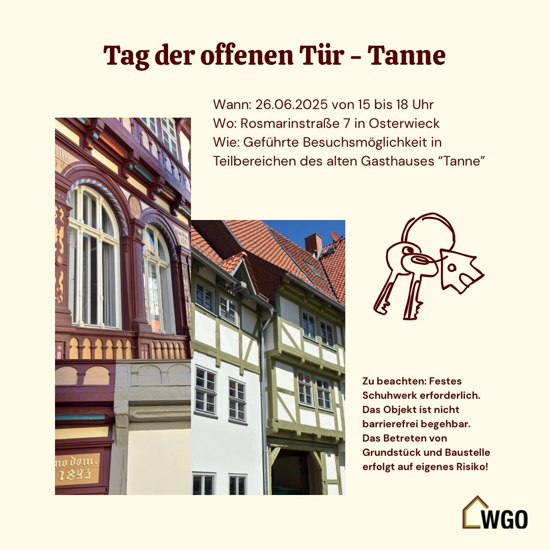 Wann? 26.06.2025, 15 bis 18 Uhr Wo? Rosmarinstraße 7 in Osterwieck Wie? Geführte Besuchsmöglichkeiten in Teilbereichen des alten Gasthauses „Tanne“ Zu beachten? Festes Schuhwerk erforderlich. Das Objekt ist nicht barrierefrei begehbar. Das Betreten von Grundstück und Baustelle erfolgt auf eigenes Risiko!