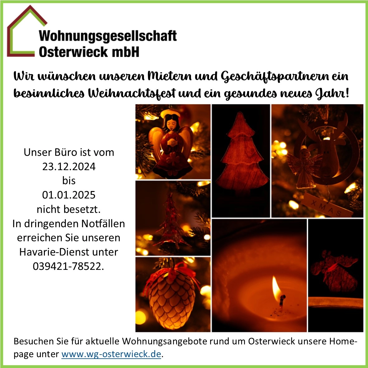 zwischen dem 23.12.2023 und dem 02.01.2024 bleibt unser Büro geschlossen. Bei Havarien stehen Ihnen die bekannten Rufnummern zur Verfügung. Wir wünschen allen Mietern und Geschäftspartnern ein besinnliches Weihnachtsfest und einen gesunden Rutsch ins neue Jahr!
